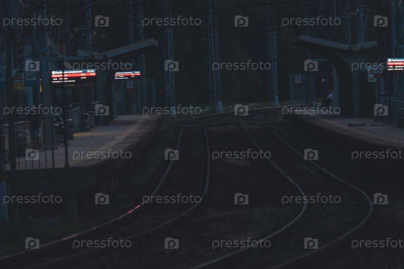 Пустой железнодорожный вокзал на закате с изогнутыми рельсами