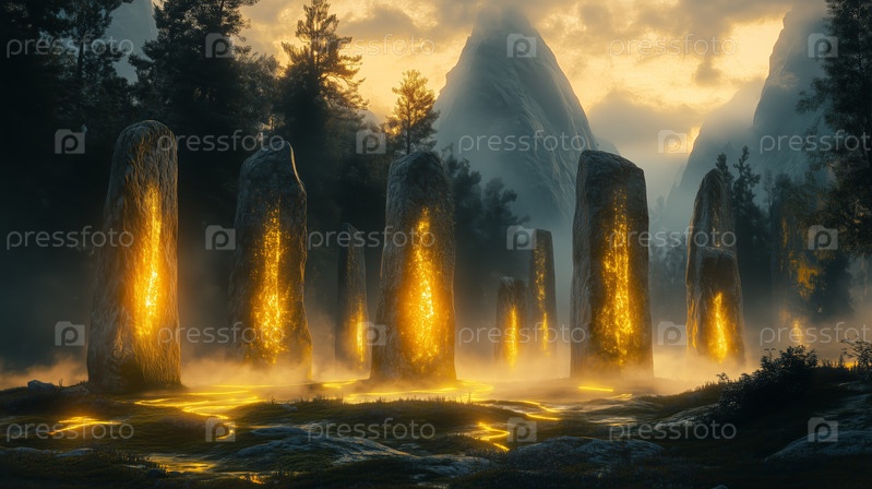 Мистические светящиеся мегалиты в туманной лесной долине