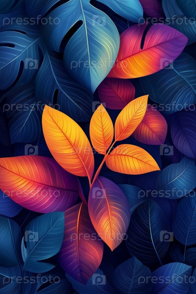 Абстрактные яркие листья с светящимися оранжевыми, красными и синими оттенками