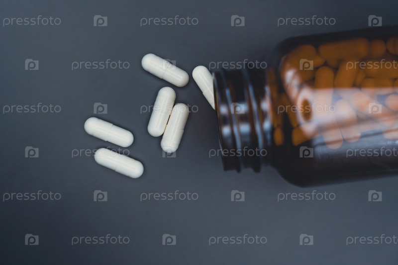 Откройте коричневую стеклянную бутылку с белыми капсулами на темном фоне