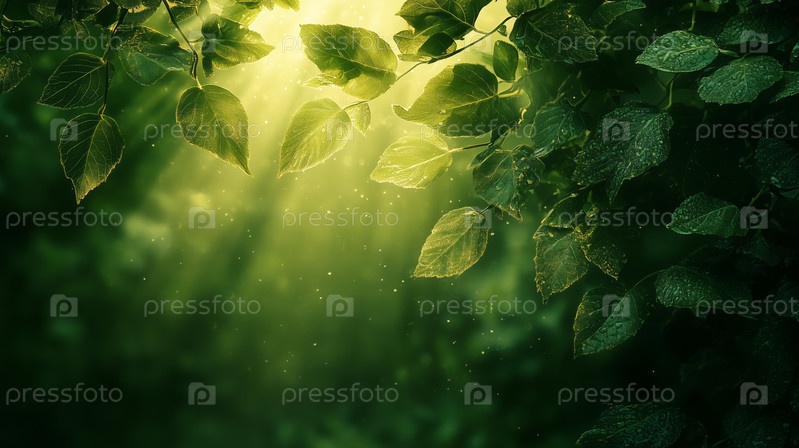 Солнечный свет течет сквозь зеленые листья с светящимися частицами пыли