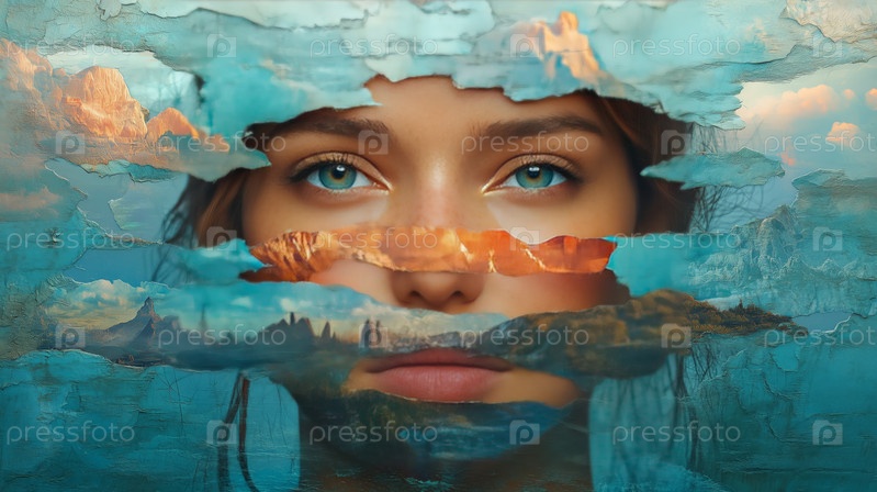 Сюрреалистический портрет женщины с голубыми глазами, смешанной со слоями пейзажа