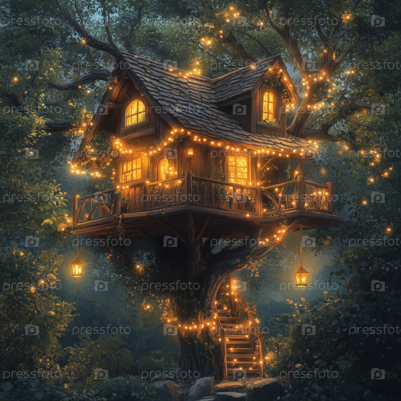 Очаровательный дом на дереве, светящийся волшебными огнями