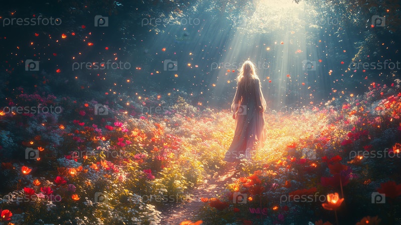 Зачарованная женщина, идущая по светящемуся цветочному лугу