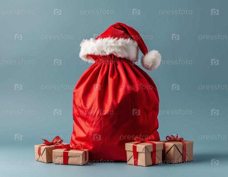 Рождественский красный подарочный пакет на минималистическом синем фоне, реплика пространства