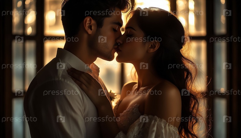 Романтический поцелуй на закате через окно