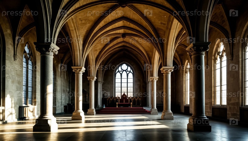 Зал средневекового дворца с каменными колоннами и арками