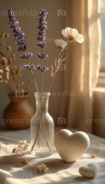 Два стебля в одной вазе керамического сердца сухие цветы мягкий боковой свет