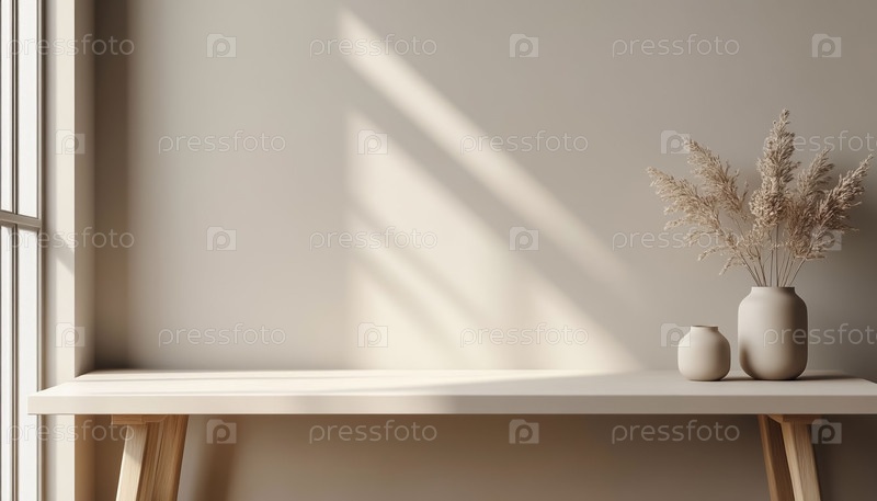 Бежево-серый фон с кувшином и сушеными цветами, дизайнерское баннеровое копирование пространства