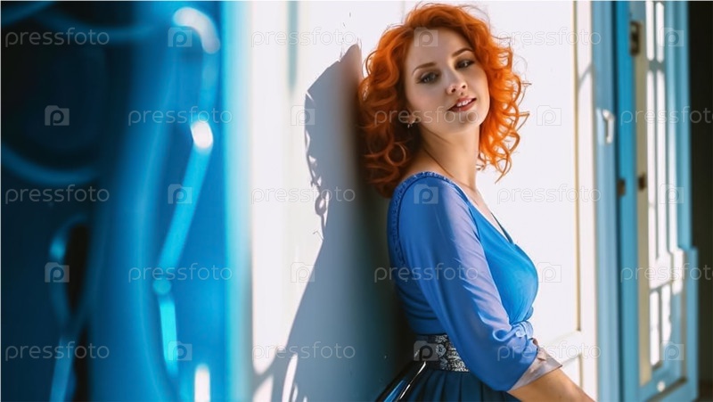 Красноволосая женщина в синем платье у окна, художественная иллюстрация