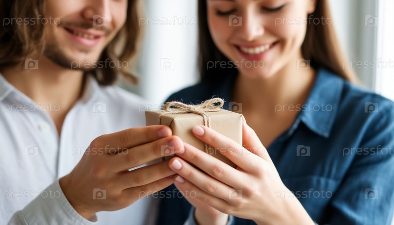 Парень дарит подарок улыбающейся девушке