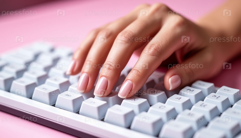 Женские руки с французским маникюром на белой клавиатуре