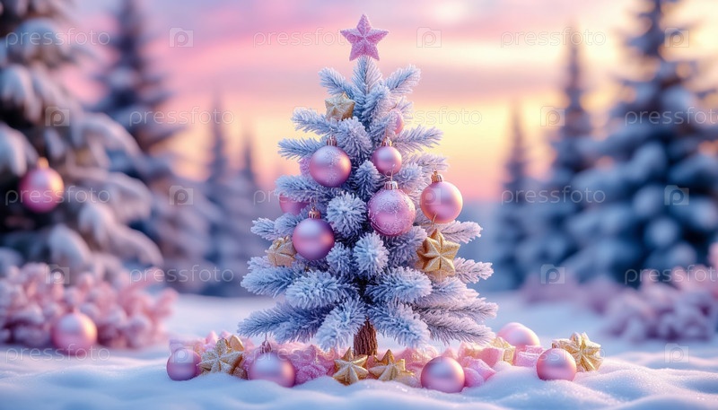 Праздничная украшенная рождественская елка в зимнем лесу пастельные пейзажи