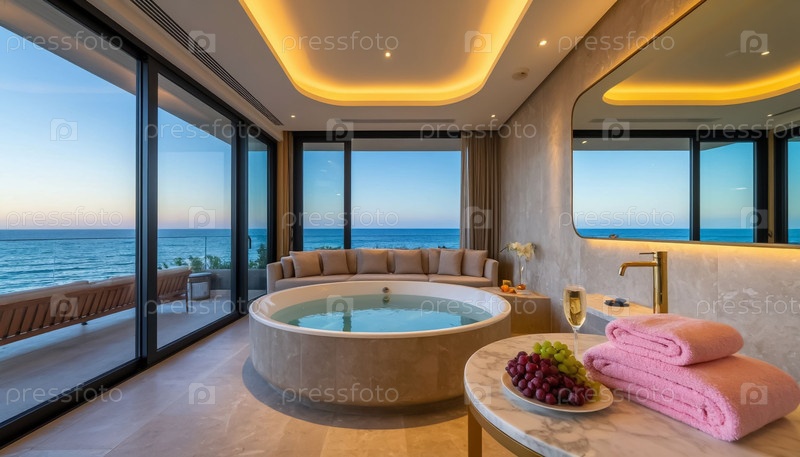 Интерьер роскошной ванной комнаты с панорамным окном и круглым джакузи, видом на море, отель