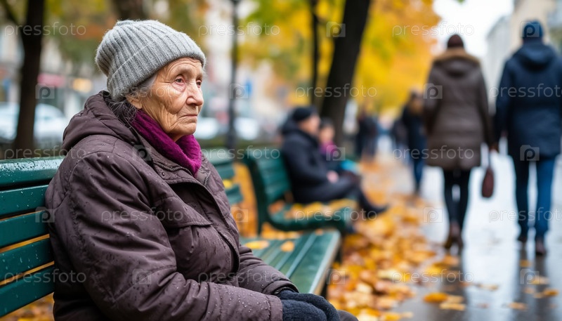 Одинокая брошенная бабушка на скамейке в городе, бездомная