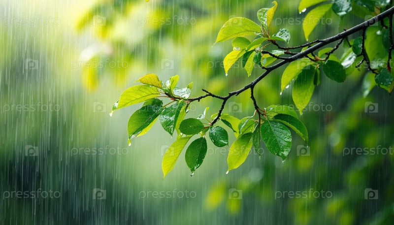 Ветвь с зелеными листьями, дождь