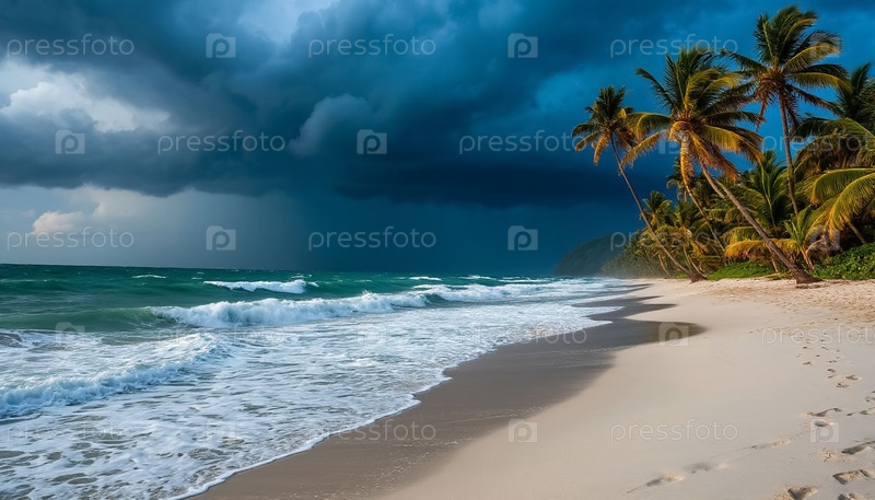 Красивый пляж с белым песком, пальмы во время шторма