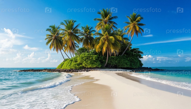 Красивый пляж с белым песком, группой пальм и голубой морской водой