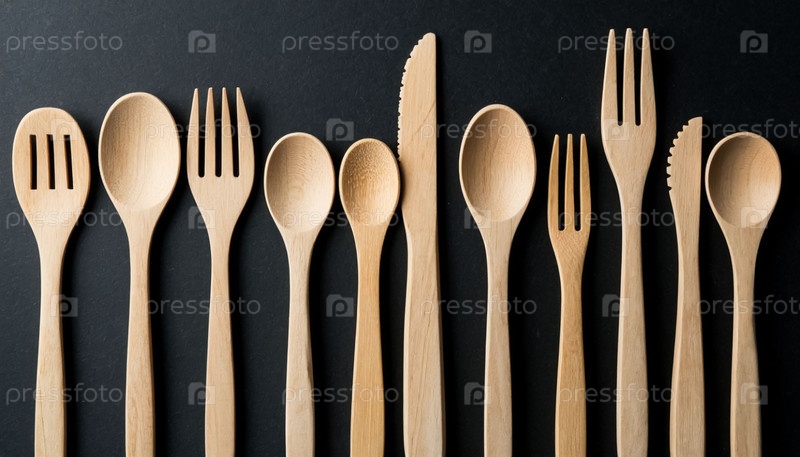 Деревянные столовые приборы - ложки и вилки на темном фоне