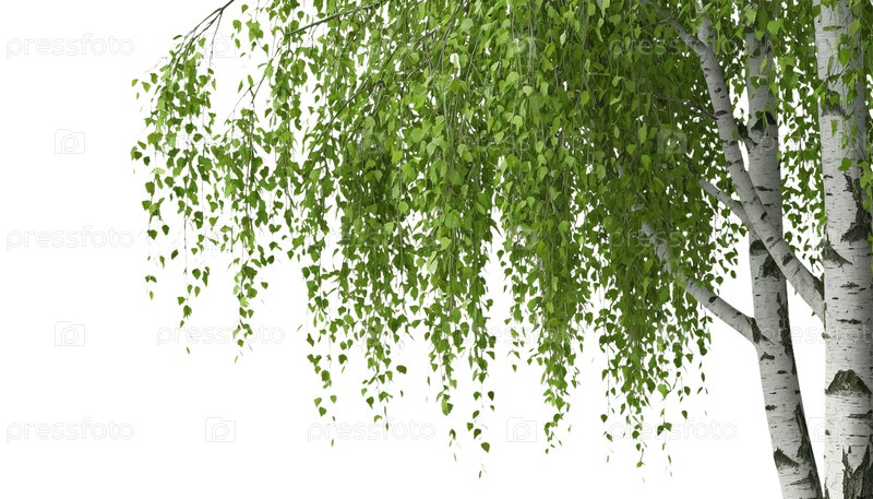 Ветви березы с зелеными листьями висят на прозрачном фоне