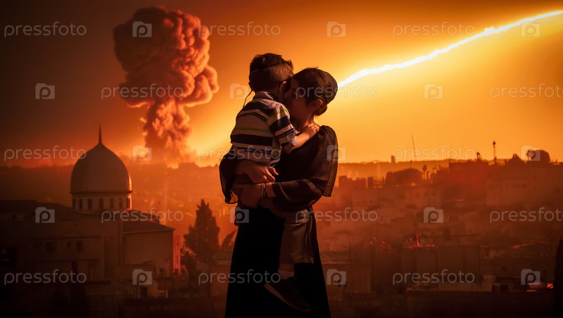 Мать с ребенком на фоне ядерного взрыва над ближневосточным городом