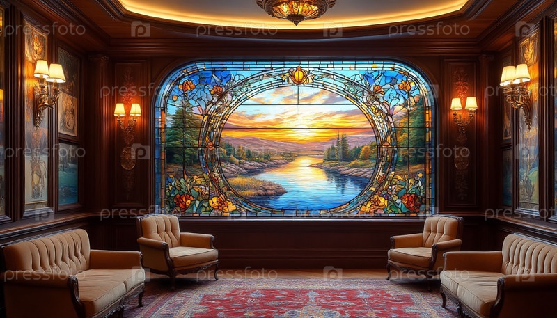 Панорамные витражные окна освещены