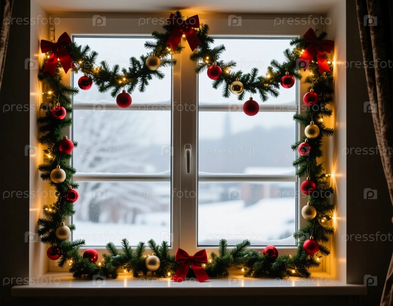 Уютное окно, украшенное праздничной гирляндой, красочные рождественские шары и теплые огни светятся мягко, усиливая зимнюю атмосферу за пределами снежного пейзажа