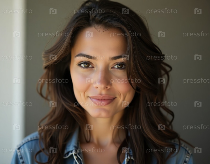 Молодая женщина с гладкими волосами излучает уверенность и грацию, стоя на нейтральном фоне