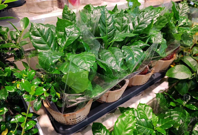 Кофейное растение Арабика в местном супермаркете.Покупки комнатных растений