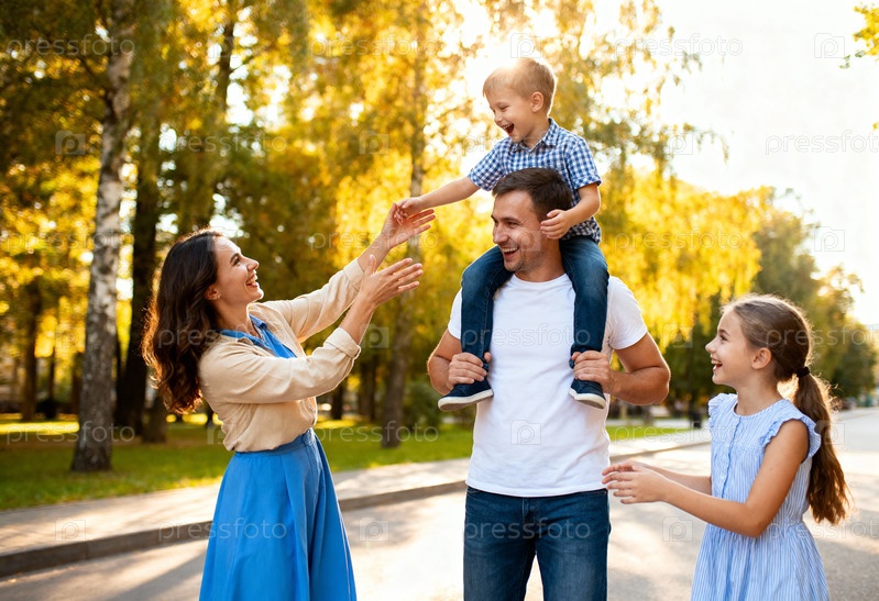 Счастливая семья наслаждается прогулкой в солнечном осеннем парке, улыбаясь и играя вместе