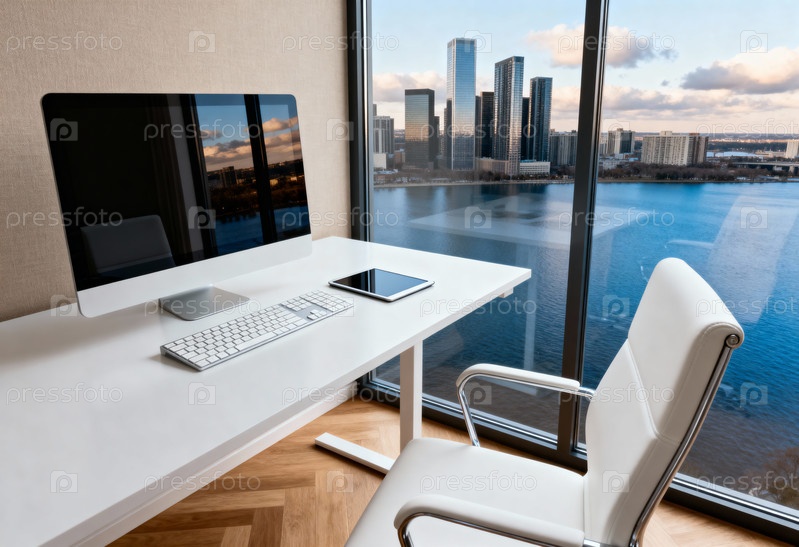 Современный офисный стол с компьютером и планшетом с видом на городской пейзаж и реку