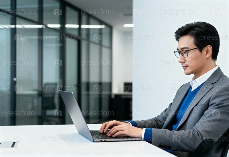 Мужчина работает на ноутбуке за столом в современной офисной обстановке