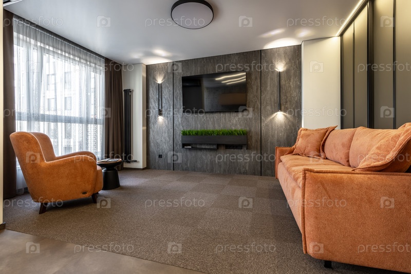 Современная гостиная с оранжевым диваном, креслом, большим окном, темным акцентом на стене и телевизором создает теплый и элегантный интерьер