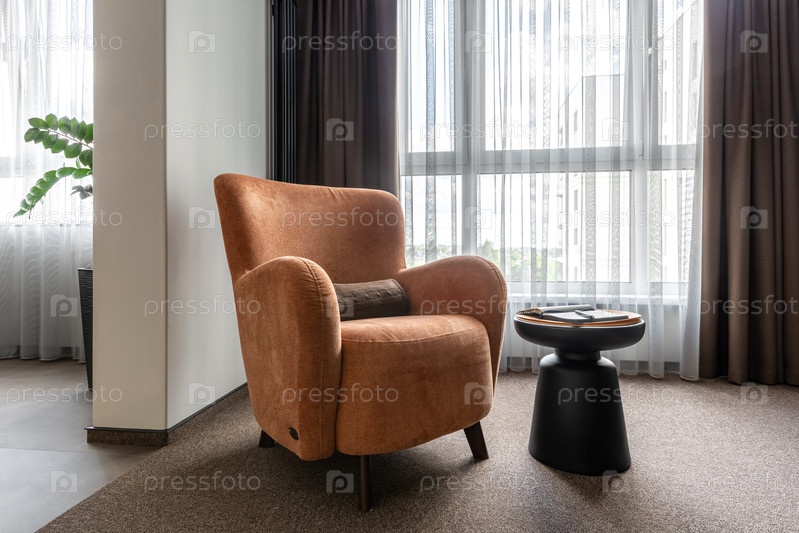 Теплый и уютный оранжевый стул возле большого окна с крутыми шторами, создающий расслабляющее место для чтения в современной квартире