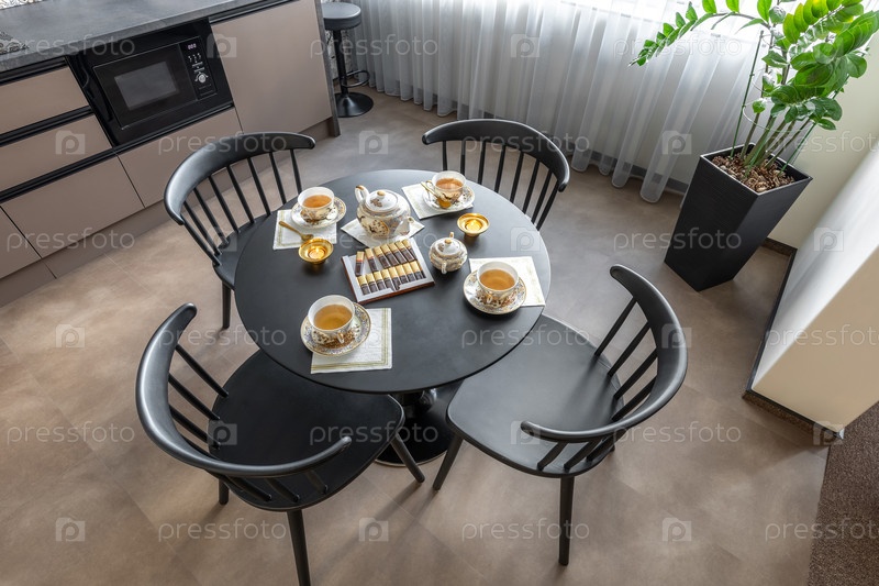 Элегантный чай на черном круглом столе в современной кухне