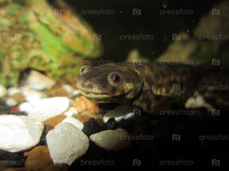 Тритон (Triturus vulgaris) средний камней в аквариуме смотрит из нас крейсер