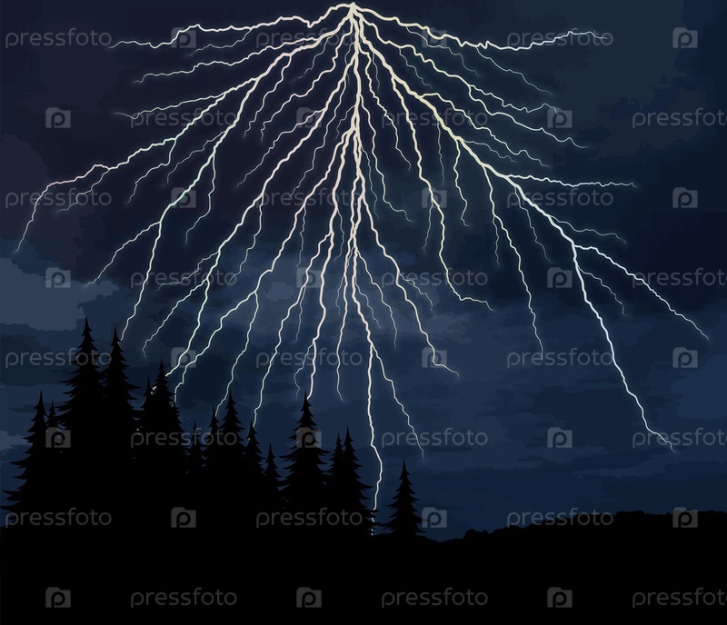 Молния в ночном небе с хвойным лесом