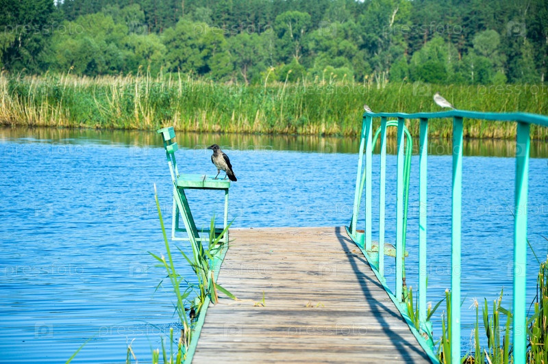 Ворона на старой деревенской причале в Ивановском заливе.Ульяновск.Россия