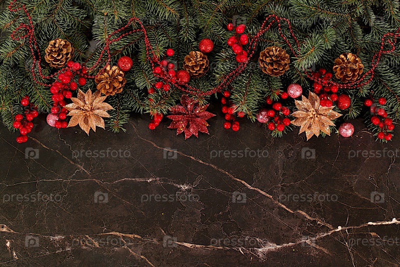 Рождество и Новый год 2026 фон с живыми ветвями сосны и праздничными украшениями на темном мраморном столе, баннер для праздничного дисплея, шаблон дизайна