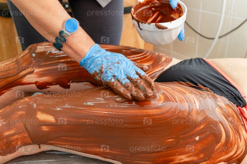 Терапевт в синих перчатках наносит богатое шоколадное покрытие тела человеку, лежащему на столе, предлагая расслабляющий и снисходительный спа-опыт