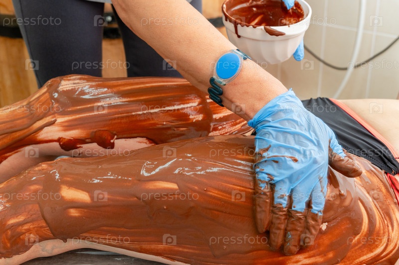 Терапевт в синих перчатках наносит богатое шоколадное покрытие тела человеку, лежащему на столе, предлагая расслабляющий и снисходительный спа-опыт