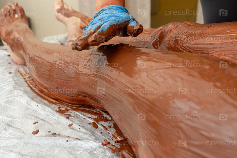 Терапевт в синих перчатках наносит богатое шоколадное покрытие тела человеку, лежащему на столе, предлагая расслабляющий и снисходительный спа-опыт