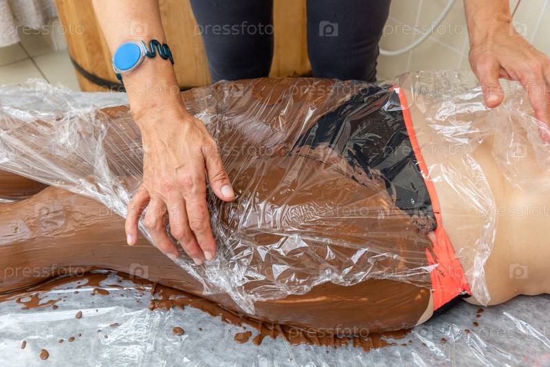 Терапевт применяет роскошный шоколад или грязную оболочку для тела к человеку