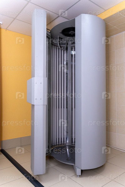 Современный вертикальный солярий с открытой дверью в плиточной комнате с желтыми стенами