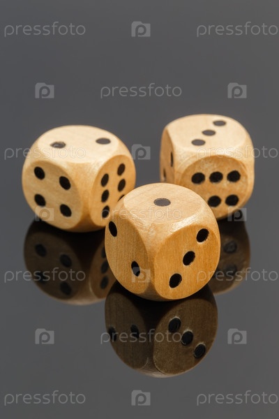 Три деревянные кости на темном фоне с отражением, крупный план