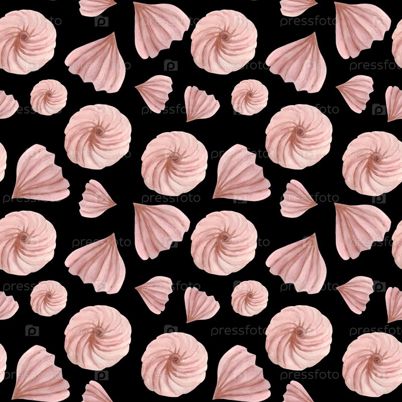 Бесшовный рисунок с розовыми нежными зефирами на черном фоне. иллюстрация сделана акварелью
