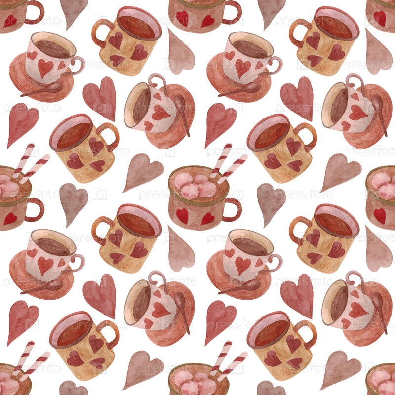 Бесшовный рисунок с кофе в сердечных кружках на белом фоне. Иллюстрация сделана акварелью. Может использоваться для меню, обложек, тканей, текстиля, обоев, открыток, упаковочной бумаги