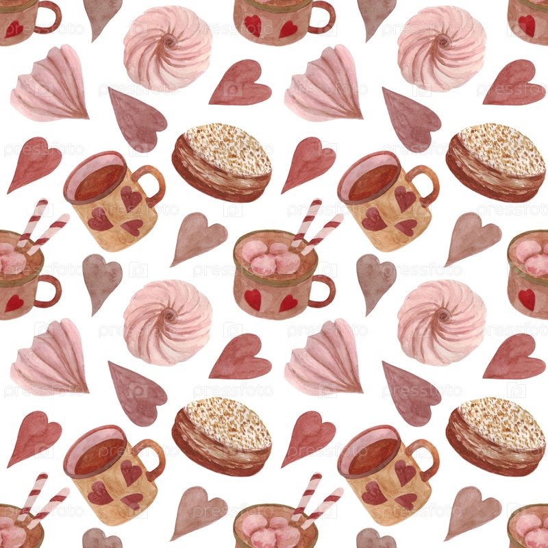 Бесшовный рисунок с кофе, нежными зефирами, тортом и сердцами на белом фоне. иллюстрация сделана акварелью