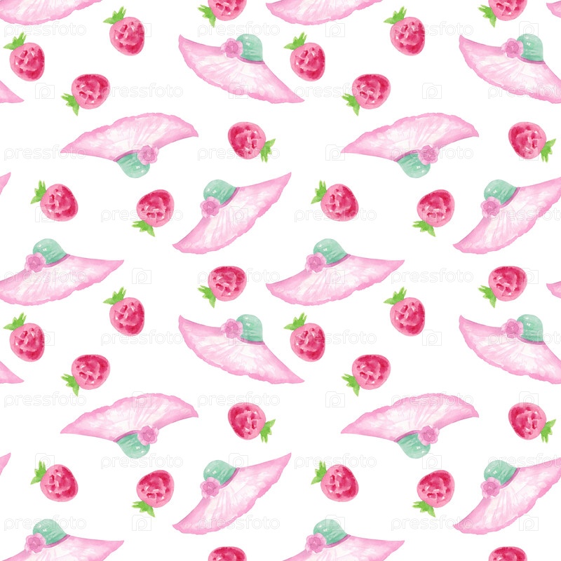 Бесшовный фон с элементами лета. Шляпы и клубники на белом фоне. Рисуйте акварели вручную. Может использоваться для ткани, упаковочной бумаги, обоев, открыток, обложек