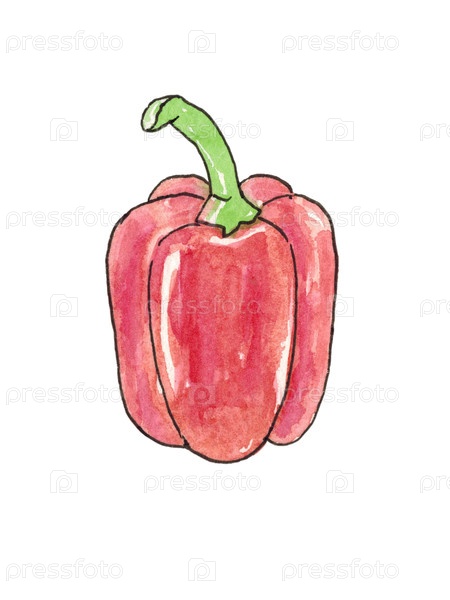 Сладкий красный перец выделен на белом фоне. Контур - живая линия. Иллюстрация написана вручную акварелью